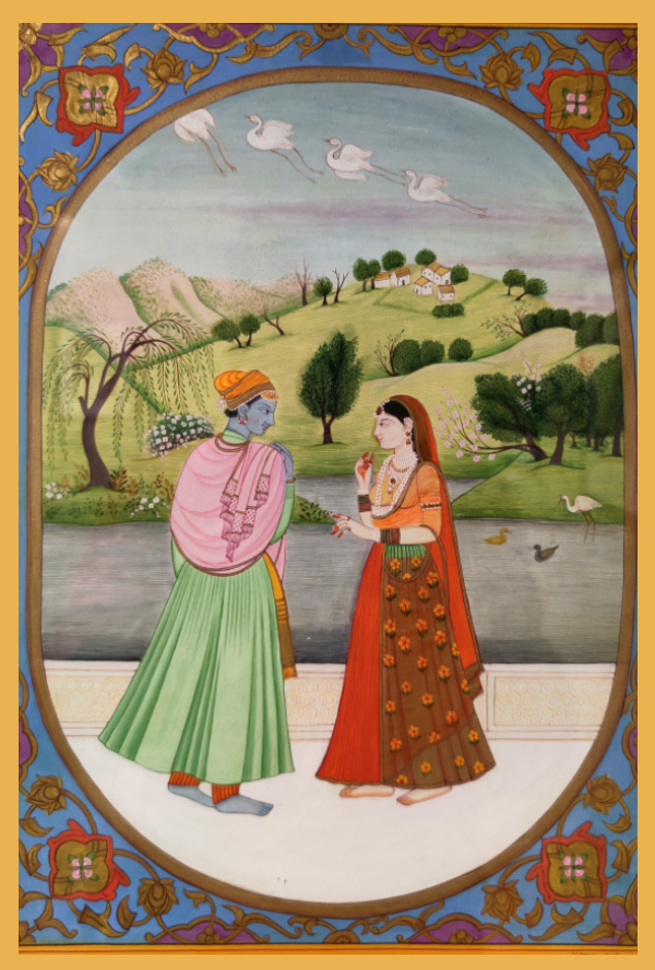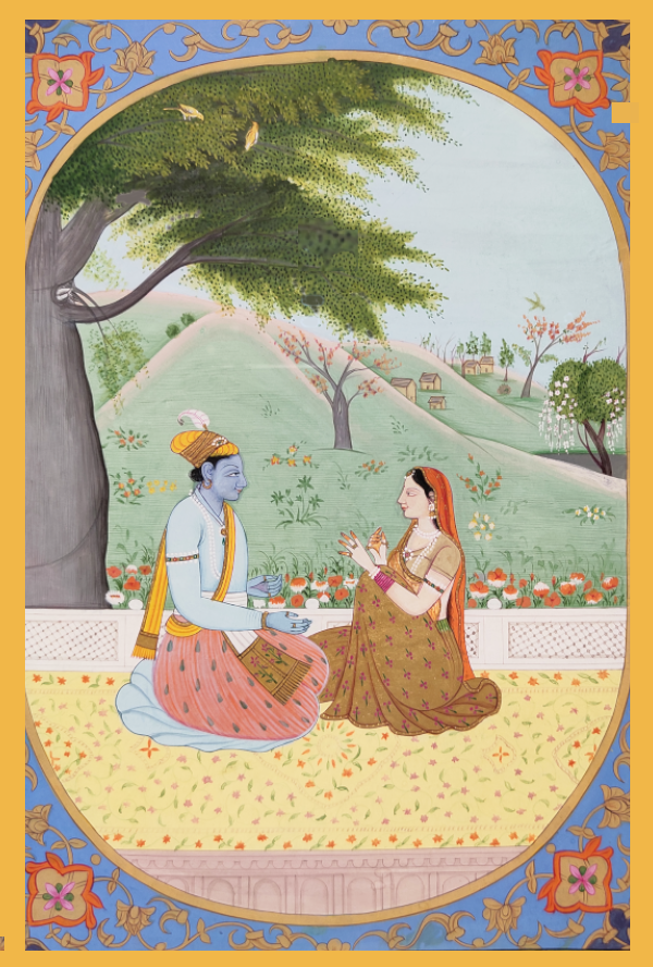 The Barahmasa theme has been depicted in Chamba, Garhwal, Guler, Kangra, Mandi and Nurpur schools from among the Pahari school. The Pahari schools developed in the hilly regions of North India during 17th to 19th century. From Jammu to Almora and Garhwal,Himachal Pradesh. the range is wide,varied and very interesting. Basohli school is from Jammu which is known for its bold colours. Kangra is famous for its Radha-Krishna depictions and its lyrical quality.; being greatly inspired by Jayadeva’s Geeta-govinda. Central India has the Malwa, Datia and Bundelkhand schools.